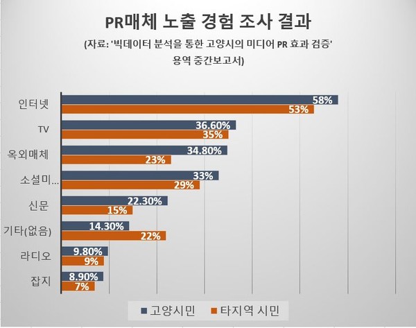 이 용역을 책임진 정윤재 한국외대 미디어커뮤니케이션학부 교수는 설문조사 결과를 토대로 “고양시민들이 고양시 소식을 가장 많이 접한 매체는 인터넷, TV, 옥외매체, 소셜미디어, 신문 순으로 나타났다”고 설명했다. 또한 “홍보매체별 중요도를 고양시민에 물었을 때도 인터넷, 소셜미디어, TV·옥외매체, 신문 순이었다”고 설명했다.