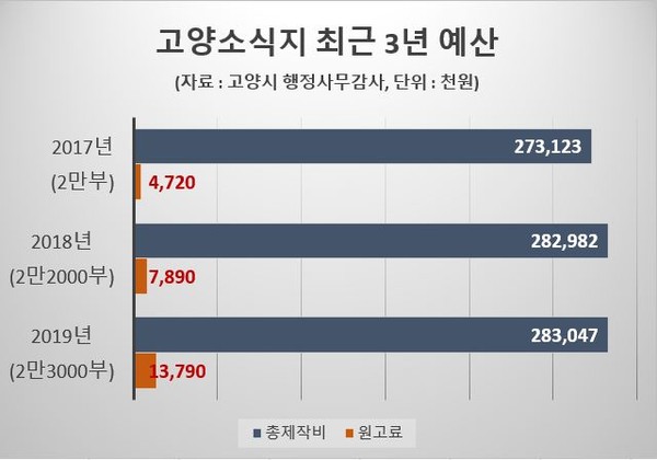 왕연우 고양시 언론홍보담당관은 “시 홍보를 위한 SNS 운영비가 1억원이 되지 않는다”고 말했다. 반면 고양시 행정사무감사 자료에 따르면, 고양소식지는 2017년 2만부 발행하는데 2억7312만원, 2018년 2만2000부 발행하는데 2억8298만원, 2019년 2만3000부 발행하는데 2억8304만원의 예산을 투여했다. 고양시는 1993년 2월 창간한 고양소식지뿐만 아니라 지난 7월부터 어르신들의 소식지인 ‘고양실버소식’이라는 종이매체를 추가 발행하기 시작했다.