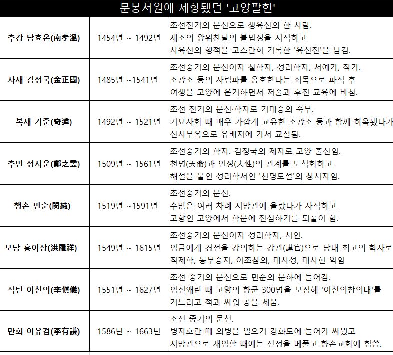 이들 고양팔현은 조선초기와 중기의 문신으로 모두 문봉서원에 제향됐다. 2001년 단국대 매장문화연구소가 발표한 ‘문봉서원지 기본조사용역 보고서’에 따르면, 고양팔현 중 정지운, 홍이상은 선대 대대로 고양이 생활 터전이었던 이들이다. 그리고 이신의는 20대에, 남효온과 김정국은 30대에 고양의 산천과 민심을 쫓아 옮겨 온 이들이다. 한편, 서원에 제향된 인물은 그 지역과 연관된 인물이 선정된다는 성격으로 보았을 때, 이유겸 또한 고양 출신이거나 이곳에서 살았을 가능성이 크다. 이들 외에 기준은 본관이 행주로 『덕양유고』, 『덕양일기』 등의 저서를 남기는 등 고양과 인연이 있고, 민순 역시 사직할 때마다 고양으로 돌아와 학문에 전념하는 등 삶의 상당부분을 고양에서 보냈다.