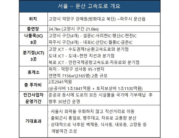 덕양구 강매동(방화대교 북단)에서 파주시 문산읍까지 4~6차선으로 연결하는 이 도로의 총연장은 34.7㎞이고 고양시 구간은 21.6㎞이다. 이 도로에는 8개의 나들목(IC)과 3개의 분기점(JCT), 2개의 영업소(TG), 1개의 휴게소가 설치됐다.