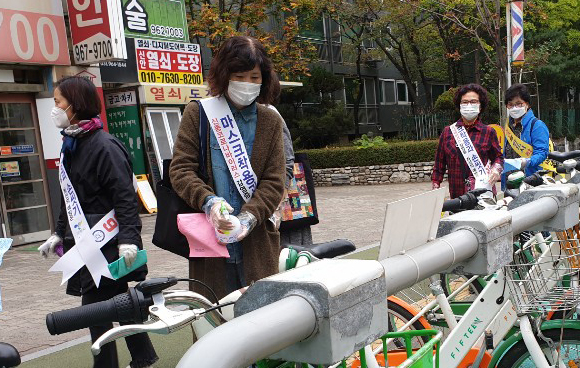 이날 화정1동 직원들과 통장협의회 회원 등 40여명은 버스정류장과 공원, 놀이터 등 지역 주민들이 자주 찾는 다중이용시설의 구석구석을 소독했다. 또한 주민들에게 13일부터 마스크 착용 의무화가 시행에 따른 적극적인 홍보도 병행했다.