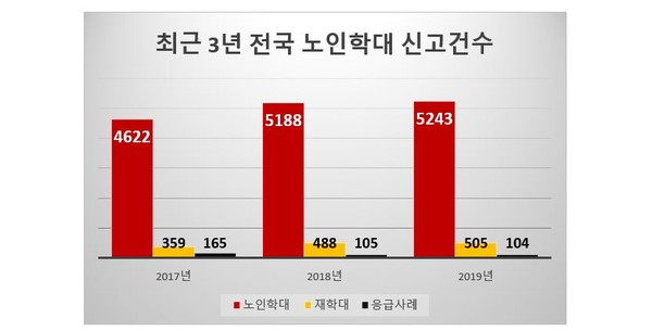 우리나라 65세 이상 전체 노인인구는 약 765만 명으로, 노인학대 신고건수는 2017년 4622건, 2018년 5188건, 2019년 5243건으로 매년 증가했다. 2019년 기준 노인학대 신고건수는 전해에 비해 10.6% 증가했고, 노인학대 신고건수 중 9%가 재학대 신고였으며, 신고건수 중 2%가 학대 정도가 심해 응급사례를 야기했다. 고양시의 경우 2019년 기준 노인인구 13만3422명 중 피해노인은 153명으로 나타났다.
