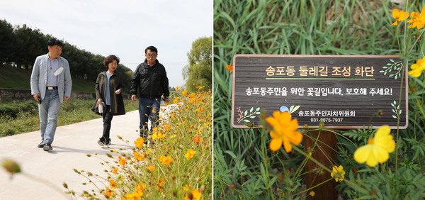 실제로 송포동은 지난 7월부터 도시길 농촌길 둘레길 3개 코스가 이어지는 송포동 둘레길 프로젝트를 진행 중이다. 내년 5월 완료를 목표로 민과 관이 머리를 맞대고 능동적인 아이디어와 공유로 사업을 추진하고 있다. 먼저 정비가 절실했던 대화천 둘레길을 조성하고 황하코스모스를 심어 걷고 싶은 하천길로 만들었다. 그렇게 되기까지 이른 아침부터 동직원들과 직능단체 위원들은 둘레길 조성 현장에 나와 서로에게 힘이 되며 꽃식재와 공사에 구슬땀을 흘렸다. 3개월이 지난 지금 주민들의 반응은 대만족이었다.