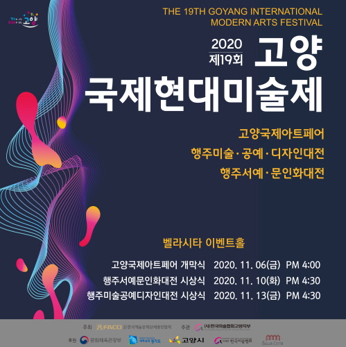 [고양신문] ‘2020 고양국제현대미술제’가 11월 4일부터 11월 15일까지 백석동에 위치한 벨라시타 이벤트홀에서 진행된다. (사)한국예술문화단체총연합회가 주최하고 (사)한국미술협회고양지부가 주관하는 고양국제현대미술제는 고양시 최대 규모의 미술축제다. 19년째 이어 오고 있는 고양국제아트페어와 26회째를 맞는 행주미술·공예·디자인대전과, 서예·문인화대전도 함께 열린다.