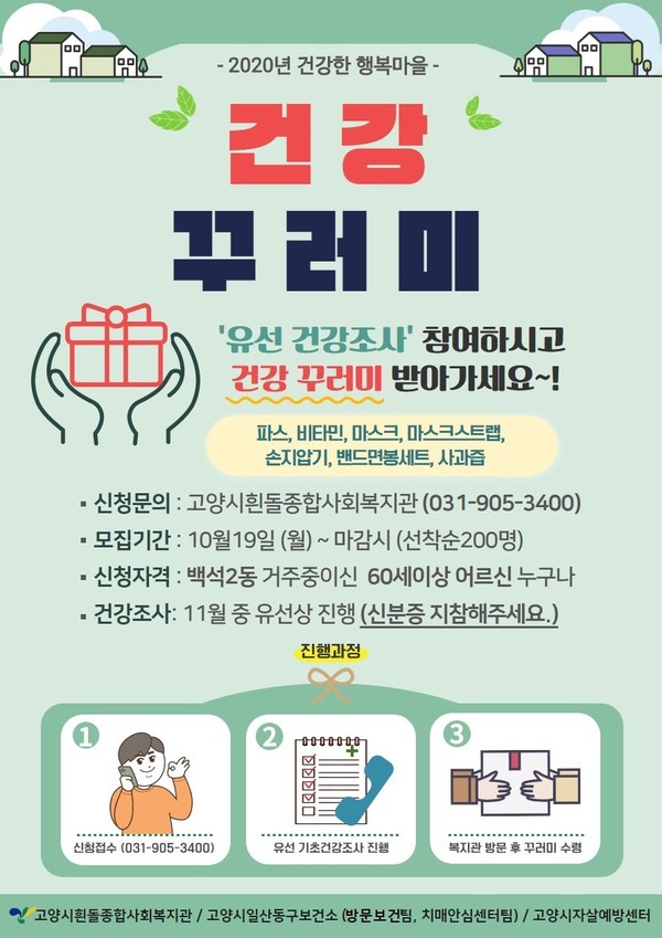건강조사 참여 대상자는 백석2동에 거주 중인 60세 이상 어르신으로, 지난 19일부터 선착순 200명을 모집 중이다. 신청과 관련 문의는 고양시흰돌종합사회복지관 031-905-3400으로 하면 된다. 일산동구보건소 관계자는 “이번 유선 건강조사 결과를 통해 추후 사업 추진 시 주민 맞춤형 프로그램을 제공할 수 있도록 노력하겠다”고 전했다.
