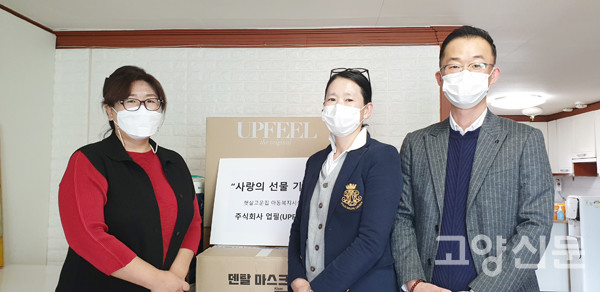 박정현 업필 대표와 임직원들이 28일 벽제동에 위치한 아동청소년그룹홈 햇살고운집(원장 김지량)을 직접 찾아 삼각등받이쿠션과 마스크 200장, 손소독제, 라면, 휴지 등을 전달하며 아이들의 건강한 성장을 위해 발 벗고 나선 것이다.