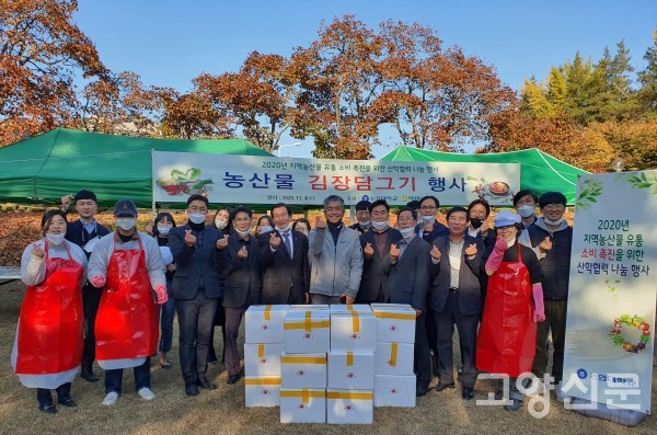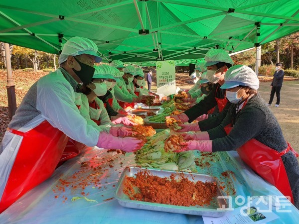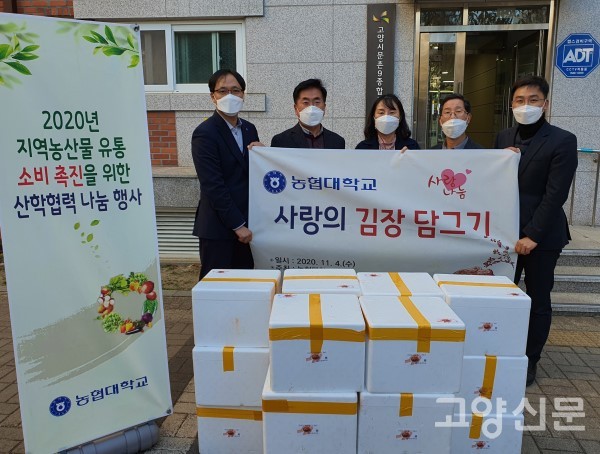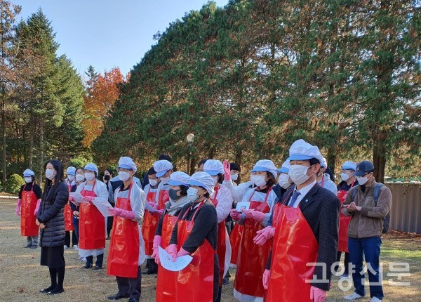 [고양신문] 덕양구 서삼릉길에 위치한 농협대학교(총장 최상목)는 지난 3~4일 이틀 동안 입동(7일)을 앞두고 학생과 교직원들이 직접 키운 배추로 사랑의 김장담그기 행사를 했다. 이날 본관 앞 잔디광장에는 최상목 총장, 김영명 교수, 김종식 교수를 비롯한 교직원과 학생, 구내식당 영양사, 고양시민 등이 참석했다.