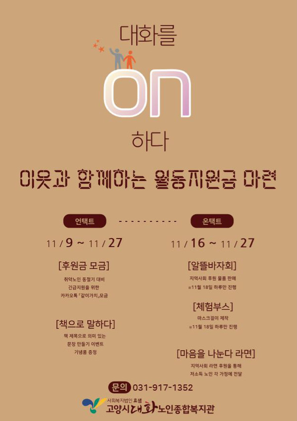 고양시대화노인종합복지관이 연말을 맞이해 복지관 이용자와 지역주민이 함께하는 독거노인 월동지원금 마련을 위한 ‘대화를 ON 하다’ 마음 나눔 축제를 연다. 이번 축제는 지역사회 내 마을복지관으로 지역주민의 주체적 참여를 통해 나눔 문화를 조성하고 지역사회에 지속적인 관심을 유도하기 위한 행사로 기획됐다. 또한 코로나19로 침체된 지역 내 분위기를 화합의 장으로 만드는 데 의미가 있다. ‘대화를 ON 하다’ 마음 나눔 축제는 11월 9일(월)부터 30일(월) 까지 진행된다.