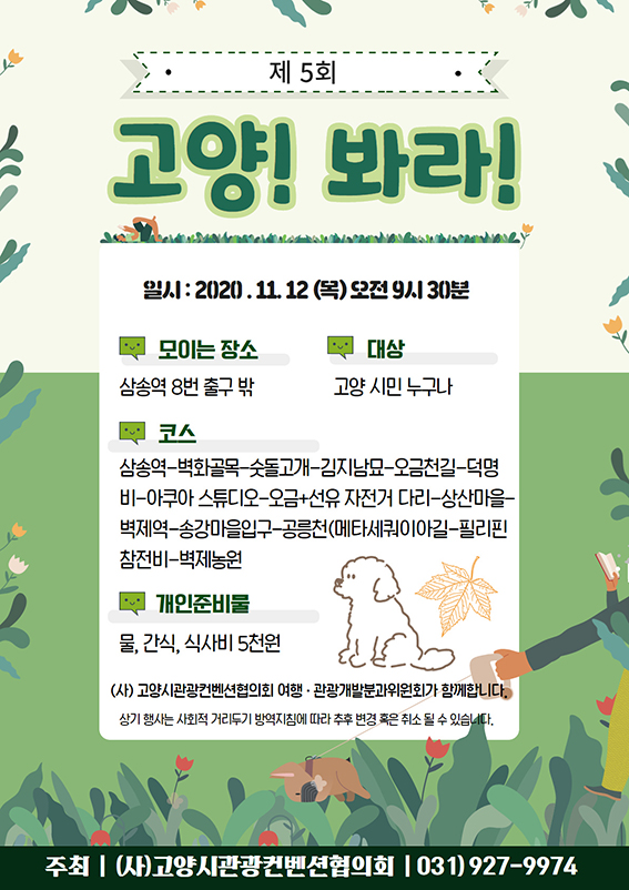 [고양신문] (사)고양시관광컨벤션협의회(회장 오준환, 이하 협의회)가 제5회 ‘고양! 봐라!’ 참가자를 모집한다. 12일에 진행되는 ‘고양!봐라!’는 ▲삼송역~벽화골목~김지남묘~덕명비~아쿠아스튜디오~벽제역~공릉천-메타세쿼이아길~필리핀참전비를 둘러보는 코스로 진행되며 전체 길이는 약 9km다.