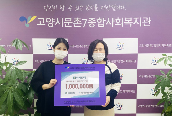 카페 리베르떼(일산서구 대화동)가 개업 1주년을 맞이해 저소득 독거 어르신 난방비 지원을 위한 성금 100만원을 고양시문촌7종합사회복지관(관장 윤 영)에 지난 11월 6일(금) 기부했다.