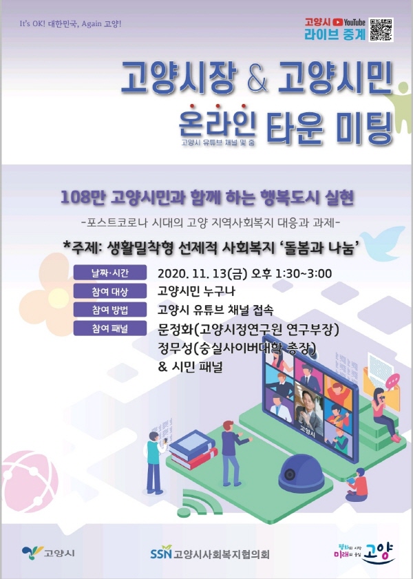 [고양신문] 치단체장과 시민들이 ‘사회복지’를 주제로 온라인을 활용해 함께 토론하고 의견을 나누는 자리가 마련된다. ‘고양시장 & 고양시민 온라인 타운미팅’이 ‘생활밀착형 선제적 사회복지, 돌봄과 나눔’을 주제로 13일(금) 오후 1시 30분부터 3시까지 진행된다.