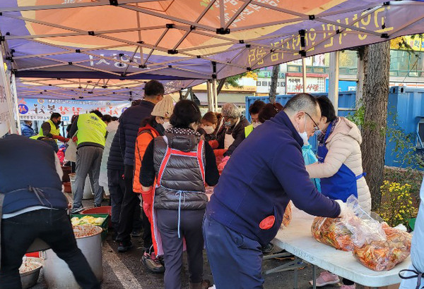 행신2동(동장 오미근) 새마을부녀회(회장 홍영숙)와 주민자치위원회(위원장 류영호)가 지난 9일부터 11일 까지 3일간 동 행정복지센터 앞마당에서 ‘사랑의 김장담그기’ 행사를 가졌다. 쌀쌀한 날씨임에도 불구하고 직능단체 회원 80여명이 참여해 배추 500포기로 김치를 담가 관내 독거노인, 장애인, 복지사각지대 가구 등 소외계층 200가구에 전달해 훈훈한 사랑 나눔을 실천했다.