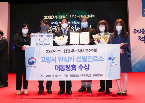 [고양신문] 고양시 ‘안심카 선별진료소’가 대통령상을 받았다. 고양시는 국무조정실·인사혁신처·행정안전부가 공동 주관하는 ‘2020년 적극행정 우수사례 경진대회’에서 ‘안심카 선별진료소’가 대통령상을 받았다고 19일 밝혔다.