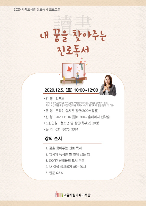 [고양신문] 가좌도서관이 또다시 집콕 생활이 길어지고 있는 청소년들을 위해 ‘내 꿈을 찾아주는 진로독서’ 프로그램을 진행한다. 12월 5일 오전 10시부터 2시간 동안 온라인 화상(zoom) 연결을 통해 실시간으로 진행되는 ‘내 꿈을 찾아주는 진로독서’의 강의는 『누가 뭐래도 내 길을 갈래』의 저자이자 은재TV 유튜브 크리에이터로 활동 중인 김은재 국어교사(부천북고등학교)가 맡는다.