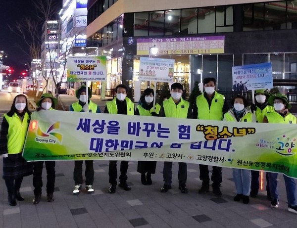 [고양신문] 고양시 원신동청소년지도위원협의회(협의회장 이은우)는 지난 27일 대학수능을 앞두고 자원봉사자 등과 함께 청소년보호 거리캠페인과 범죄예방활동 청소년선도 활동을 실시했다. 코로나19 방역 2단계라는 상황 속에서 감염예방 지침에 따라 청소년지도위원과 자원봉사자 등 필수인원만 참여한 활동이었다.