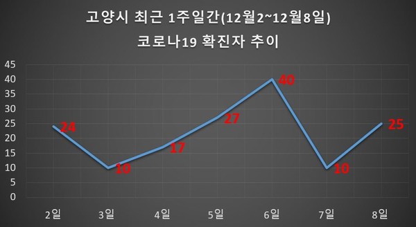 요양원발 확진자를 제외하면 최근 고양시 확진자 중에서 가족 감염이 두드러지는 것으로 나타나고 있다. 12월 1~8일까지 8일 동안 고양시 확진자는 총 176명으로 이중 57명이 가족감염에 의한 확진자로 나타났다. 요양원발 확진자를 제외하면 확진자의 43.8%가 가족감염에 의해 나타난 셈이다.