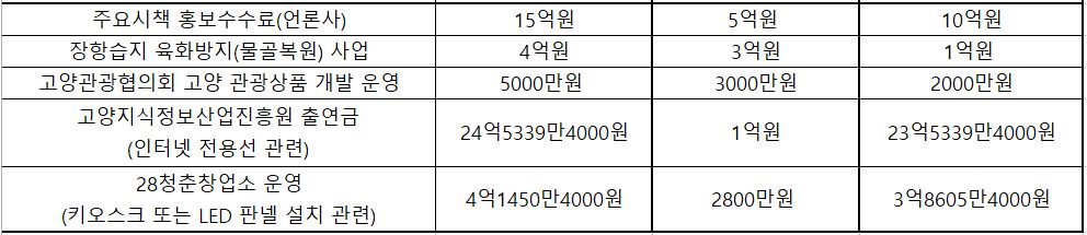 시가 내년 신규사업으로 ‘생활체육 고양시민리그(GY-리그) 운영’ 예산으로 책정한 3억1320만원도 전액 삭감됐다. 시는 내년부터 축구·야구·탁구·볼링 등 4개 시범종목에 한해 체계적인 리그전 형식으로 대회를 진행하는 ‘GY-리그’를 시행하려고 했지만 제동이 걸렸다.