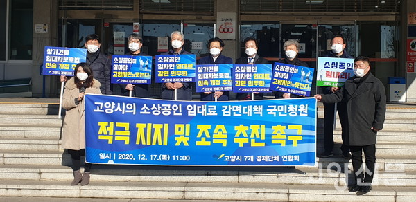 고양시소상공인연합회, 고양상공회의소, 기업경제인연합회, 슈퍼마켓협동조합, 사회적경제기업협의회 등 7개 단체는 17일 기자회견을 열고 고양시가 정부에 요청한 ‘소상공인 임대료 감면대책’을 적극 지지한다는 입장을 밝혔다. 해당 단체들은 “코로나19 사태 장기화로 인해 소상공인과 자영업자는 극단적 위기에 직면했고 언제 끝날지 아무도 장담할 수 없는 상황”이라며 “더 이상 임대인 선의에만 의존할 것이 아니라 법률과 제도를 통해 임대료 감면 의무화 및 재정지원에 나서야 한다”고 주장했다.