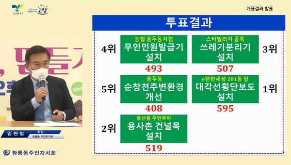 투표 결과, 총 투표수 2,477표로 1위는 대각선 횡단보도 설치(e편한세상 201동 앞), 2위 용사촌 건널목 설치(동산동 주민부락), 3위 쓰레기 분리수거기 설치(스타빌리지 골목), 4위 무인민원발급기 설치(농협 용두동 지점), 5위 순창천 주변 환경 개선(용두동) 순으로 결정됐다.