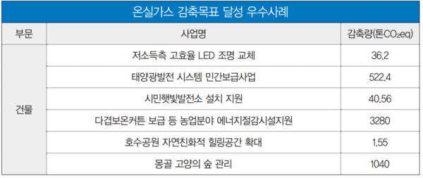 목표 이상의 성과를 거둔 대표적인 사업 중 하나는 저소득층 고효율 LED조명 교체 사업이다. 올해 120가구를 대상으로 조명기기 635개를 LED로 교체해 목표치를 초과 달성했다(36.2톤 감축). LED교체를 통해 에너지효율을 높이고 전기사용량을 줄임으로써 온실가스 배출을 줄일 수 있다는 것이 시의 설명이다.