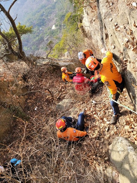 구조활동에 직접 참여한 고양소방서 원당 119구조대도 A씨가 일행과 함께 하산하는 중 암벽에서 스틱 부주의로 무게 중심이 쏠리면서 정상에서 70m 아래 절벽으로 추락해 절벽중간(30m)에 걸쳐있었던 것으로 보고 있다.