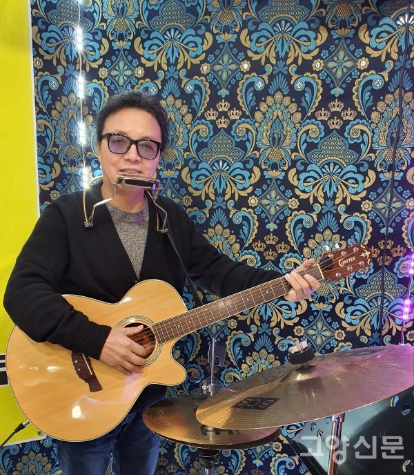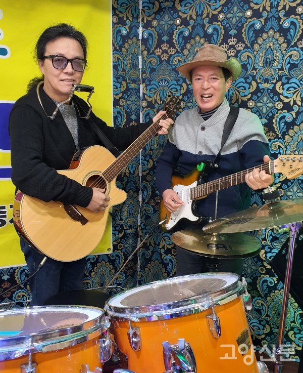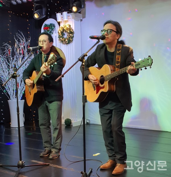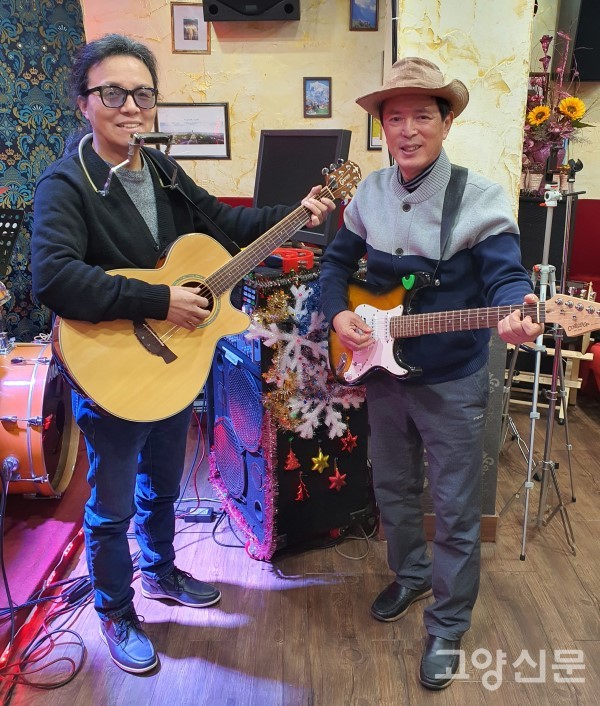 [고양신문] 김명남(62세, 사진 오른쪽), 이광원(57세)씨는 통기타 선율이 전해주는 마법 같은 매력으로 코로나 우울함을 날려버리며 듀엣 활동을 이어오고 있다.