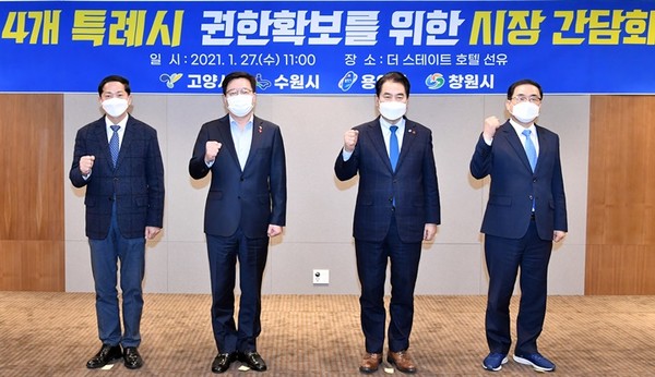 인구 100만 이상 4개 대도시는 2022년 1월 13일 정식 출범하는 특례시의 권한확보를 위해 힘을 합치게 된다. 이재준 고양시장과 염태영 수원시장, 백군기 용인시장, 허성무 창원시장은 27일 서울 영등포구 더스테이트호텔에서 특례시 권한 확보 방안을 위한 간담회를 개최했다.