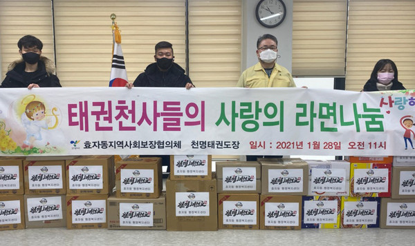 같은 날 효자동(동장 양재관)에는 관내 위치한 천명태권도&줄넘기 클럽(관장 안재준, 이하 천명태권도장)에서 ‘태권천사’들이 찾아와 고사리 손으로 모은 라면 855개를 기부했다. 코로나19로 운영이 힘든 상황임에도 불구하고 원생들과 한마음 한뜻으로 나눔에 나선 천명태권도장 안재준 관장은 “원생들이 십시일반으로 모은 만큼 라면의 종류는 모두 다르지만 그 사랑은 모두 크고 값지다”며 “어려운 이웃들에게 큰 힘이 됐으면 좋겠다”고 말했다.