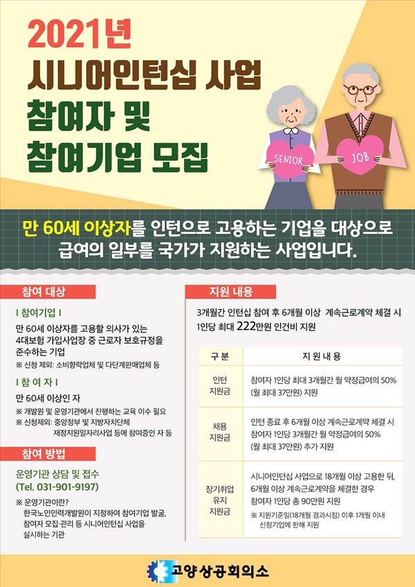 [고양신문] 고양상공회의소가 보건복지부와 한국노인인력개발원이 주관하는 ‘2021년 시니어인턴십 사업’ 수행기관으로 선정돼 참여기업을 모집하고 있다고 밝혔다. 고양상의는 2011년부터 해당 사업을 지속적으로 진행해오고 있다.