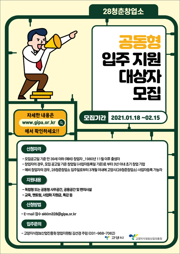고양시가 조성하고 고양지식정보산업진흥원(원장 오창희)이 운영하고 있는 28청춘창업소가 참신한 아이디어를 가진 청년 창업가와 초기 창업 기업의 성장을 지원하고자 2월 15일까지 공동형 입주 공간에 입주할 창업 기업 6개사를 모집한다.