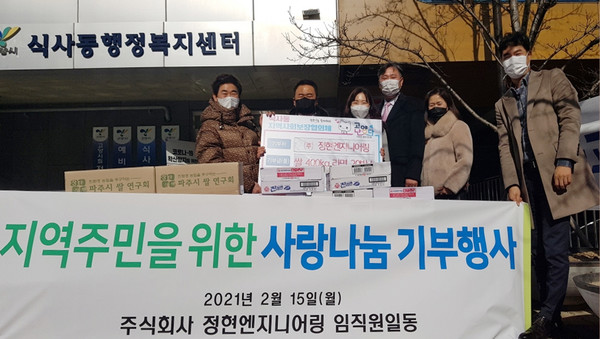파주시 문화로 위치한 ㈜정현엔지니어링 관계자는 “이번 기부가 코로나19의 장기화로 인한 경제적 어려움을 겪고 있는 저소득층에게 도움이 되었으면 좋겠다. 앞으로도 지역사회와 함께 성장하는 기업이 되도록 노력하겠다”라며 소감을 전했다.
