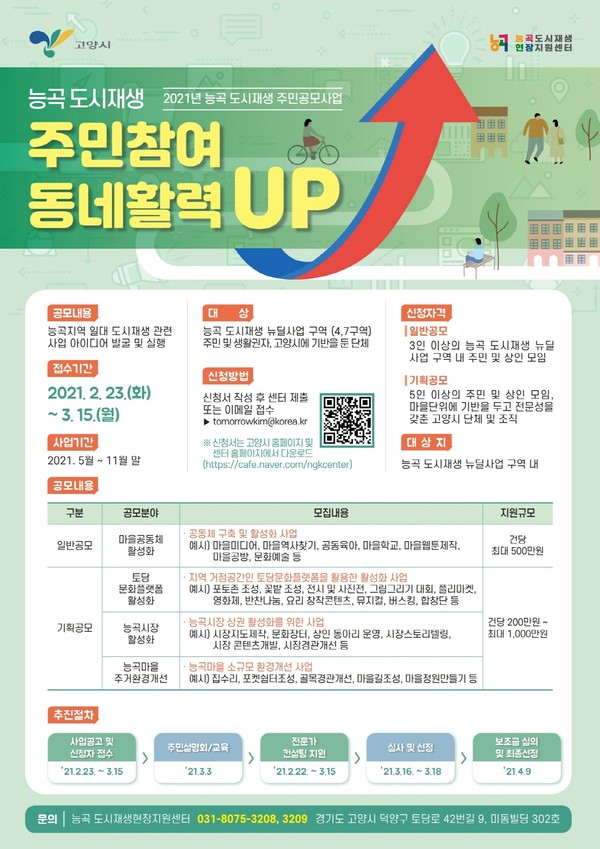 신청자격은 능곡 도시재생 뉴딜사업 구역 거주자 또는 생활권자 그리고 고양시에 기반을 둔 단체 등으로 사업대상 지역과 공모 유형에 따라 차이가 있다. 신청서 작성 후 오는 3월 15일까지 능곡 도시재생현장지원센터를 직접 방문하거나 이메일(tomorrowkim@korea.kr)로 제출하면 된다.