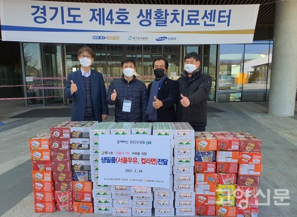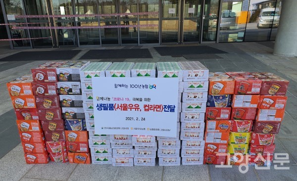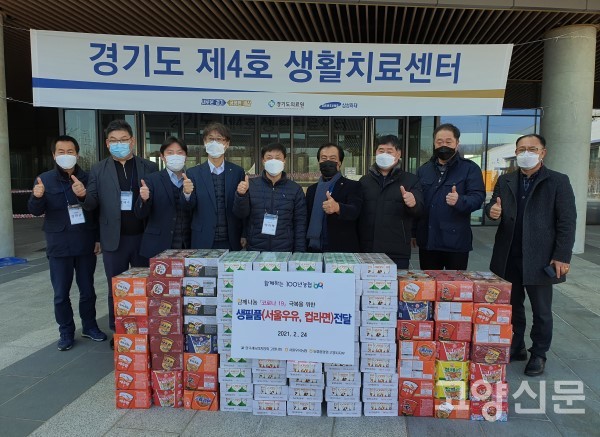[고양신문] 한국새농민중앙회 고양시회(회장 이완주), 서울우유농협(조합장 문진섭), 농협중앙회 고양시지부(지부장 김재득)는 24일 일산동구 설문동에 위치만 삼성화재 글로벌캠퍼스 내 코로나19 생활치료센터에 서울우유 50박스, 컵라면 20박스 등 150만원 상당의 지원물품을 전달했다.