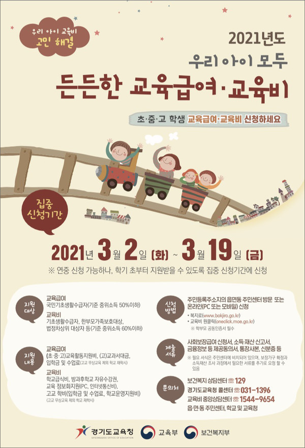 고양시가 오는 3월 2일부터 19일까지 초·중·고 학생 교육급여 및 교육비에 대한 집중신청기간을 운영한다. 교육급여와 교육비는 연중 신청 가능하지만, 학령기 학생들이 학기 초부터 지원받을 수 있도록 하기 위해 이번 집중신청기간을 시행한다.