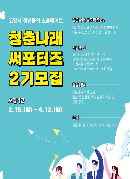 고양시정신건강복지센터가 고양시 청년들의 소울메이트 ‘청춘나래 써포터즈’ 2기로 활동할 대(휴)학생을 오는 4월 12일까지 모집한다. ‘청춘나래 써포터즈’는 취업, 학업, 결혼 등 다양한 스트레스에 놓여 있는 고양시 청년들에게 마음건강의 중요성을 알리고, 청년들 스스로 정신건강을 돌보며 함께 나눌 수 있는 2030 청년모임이다.