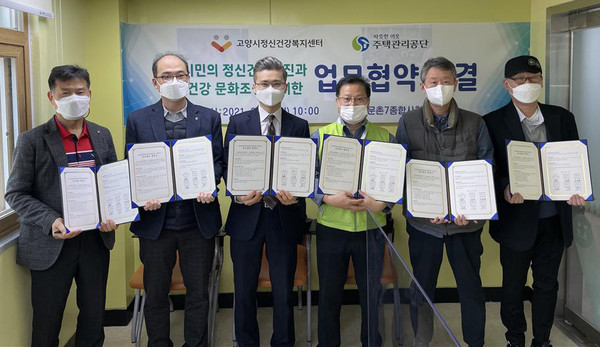 고양시정신건강복지센터가 3월 16일, 건강한 주거문화 형성을 위해 주택관리공단(일산문촌7단지관리소, 일산문촌9단지관리소, 일산흰돌4단지관리소, 능곡샘터2단지관리소, 능곡샘터3단지관리소)과 업무 협약(사진)을 체결했다.