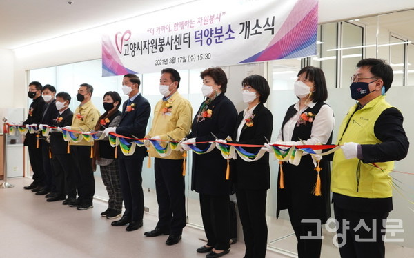 [고양신문] 고양시 자원봉사자들의 오랜 숙원이던 ‘고양시자원봉사센터 덕양분소’가 문을 열었다. 17일 열린 개소식에는 이재준 고양시장과 이길용 고양시의회 의장 및 기획행정위 소속 시의원, 센터 법인 이사와 자원봉사단체 대표 등이 참석해 덕양분소의 출발을 축하했다.