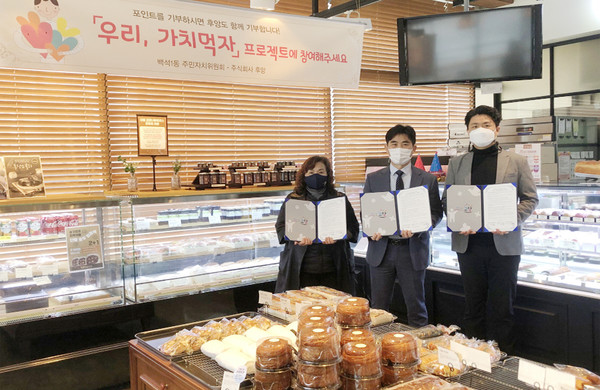 백석1동 주민자치위원회(위원장 김영숙)가 주민들이 직접 참여해 나눔의 기쁨을 누리고 지속가능한 기부문화 조성을 위한 ‘우리, 가치먹자 프로젝트’를 시작했다. “쉽고 즐겁게 할 수 있는 소소한 선행이 생활 속에서 널리 퍼져야 한다”는 아이디어로 출발한 이번 프로젝트는 주민이 지역 중소기업인 후앙 베이커리의 제품을 구입 할 시 적립금을 기부하면 후앙 베이커리도 동일한 금액을 기부하는 공동기부 사업이다.