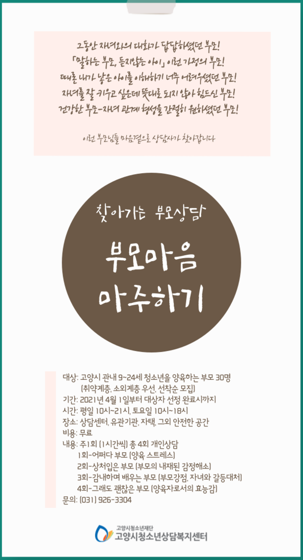 고양시청소년재단이 운영하는 고양시청소년상담복지센터가 올해 4월부터 “부모가 달라지면 자녀도 달라지고 가정도 행복하다”는 슬로건으로 부모 효능감 강화 프로젝트 ‘찾아가는 부모상담’을 시작한다.