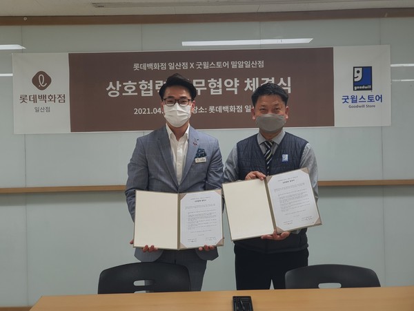 [고양신문] 롯데백화점 일산점(부점장 박재현)과 굿윌스토어 밀알일산점(원장 송동근)이 2일 롯데백화점 일산점에서 지역사회의 공유가치 창출 목적 상호협력과 발전을 위한 업무협약(MOU)를 체결했다.