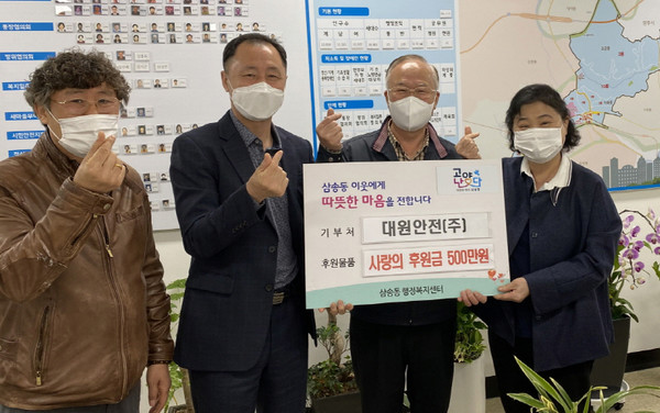 삼송동 소재 대원안전㈜(대표 김용진)이 가정형편이 어려운 이웃들을 위해 써달라며 사랑의 후원금 500만 원을 삼송동(동장 김동원)에 기부했다. 대원안전㈜는 1982년 설립된 산업안전용품 전문 회사로 개인 보호 장비, 소방안전 장비과 방역 물품을 생산 유통하고 있다. 최근에는 50여 명의 직원들이 코로나19 방역 관련 위생용품 보급으로 구슬땀을 흘리고 있다.