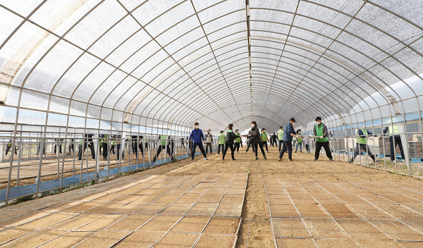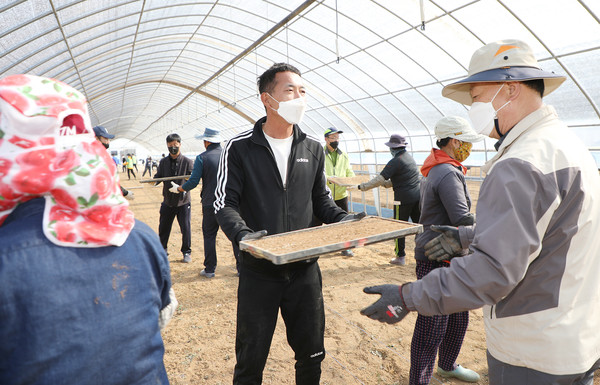 토요일 오전 7시. 농업경영인회 지도지구회 회원들과 지도농협 임직원들이 삼삼오오 모이기 시작했다. 잠시 인사를 나눈 뒤 지도지역 지역농가들과 농민, 지도농협 임직원들은 바로 올해 풍년을 예약할 모판을 나르기 시작했다. 지도농협이 4월 10일(토) 덕양구 대장동 지도농협 육묘장에서 농촌봉사활동을 진행했다. 지도농협 임직원들과 한국농업경영인 지도지구회 회원들은 주말도 잊은 채 코로나19 예방을 위해 마스크를 쓰고 파종과 모판 7,000여 장을 담고 옮겼다.