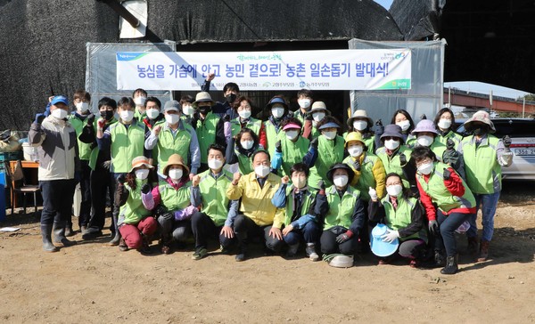 범농협 전국동시 영농지원 발대식 및 농촌일손돕기가 고양시에서는 4월 14일(수) 오전 9시부터 저녁까지 덕양구 토당동 일대에서 있었다. 이번 일손돕기는 농가인구 감소와 코로나19로 인한 외국인 근로자 입국 지연 등으로 일손 확보에 어려움을 겪고 있는 농업인 지원을 위해 진행됐다. 고양시에서는 농협중앙회 고양시지부(지부장 김재득)와 지역의 6개 농협(벽제·일산·원당·신도·송포·지도농협) 농촌봉사단이 참여했다.