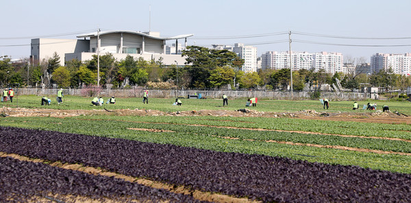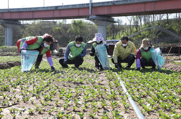 이날은 고양시 여성단체 고향주부모임과 농가주부모임 회장단과 회원 고양시 지역농협 임직원 등 50여 명이 참여했다. 봉사단은 얼갈이와 시금치 등이 심어져 있는 2만 4천여 평의 밭에서 봄이 되면서 자라 올라오는 풀을 뽑고 자잘한 돌을 골라냈다. 한쪽에서는 길가와 농로에 흩어져 있는 폐비닐과 쓰레기 수거 작업을 하며 농지 주변 환경 개선 활동도 병행했다.