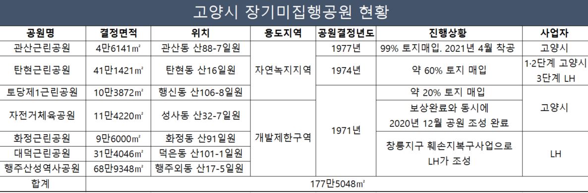 [고양신문] 계획은 되어 있었지만 조성사업이 오랫동안 미뤄졌던 고양시의 7개 장기미집행 공원이 기능을 할 수 있도록 행정절차를 밟고 있다.