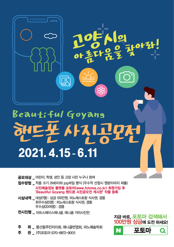 고양시민이면 누구나 참여할 수 있으며 주제는 자유롭게 선정하면 된다. 고양시의 아름다운 이야기를 휴대폰에 담아 포토마(www.fotoma.co.kr) 홈페이지에서 회원가입을 한 후, ‘핸드폰 사진공모전’ 게시판에 접수하면 된다.