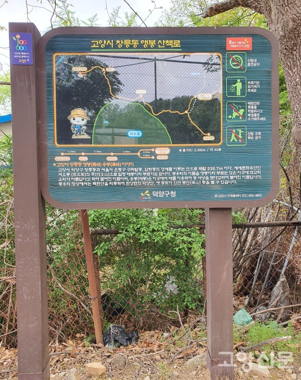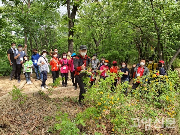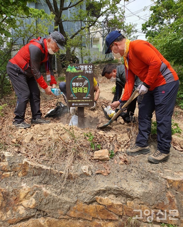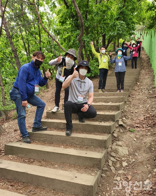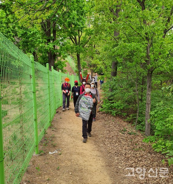이번 행사는 지난 12일 1차 창릉동 산책길(제2코스) 발굴사업의 일환으로 리본달기와 안내판 기초 작업에 이은 2차 행사로 열렸다. 창릉동 운동장에서 출발한 일행은 연초록 숲길의 싱그러운 산길을 걸으면서 추가로 리본 달기를 하고, 정상에 도착해서 안내판을 설치했다.