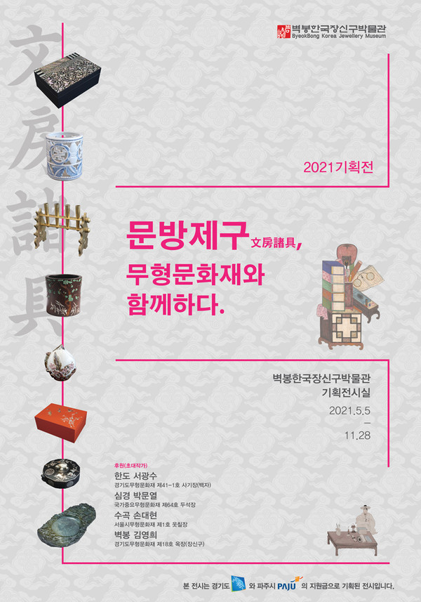2021 기획전 ‘문방제구, 무형문화재와 함께하다’는 5월 5일 수요일부터 11월 28일 일요일까지 진행된다. 전시에 대한 자세한 사항은 벽봉한국장신구박물관(031-949-0848)으로 문의하면 된다.