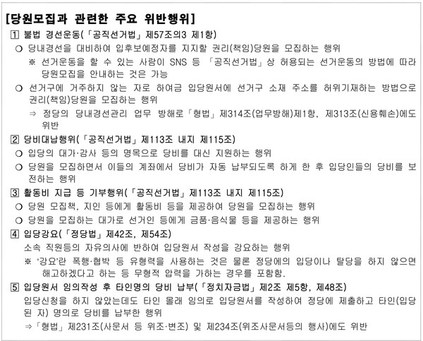 중점 예방·단속 대상은 불법 경선운동(「공직선거법」제57조의3제1항)과 당비대납행위(「공직선거법」제113조 내지 제115조), 활동비 지급 등 기부행위(「공직선거법」제113조 내지 제115조), 입당강요(「정당법」제42조, 제54조), 입당원서 임의작성 후 타인명의 당비 납부(「정치자금법」제2조제5항, 제48조)등이다. 이외에도 정당·국회의원·지방의회의원·지방자치단체장·입후보예정자 등에게 관련법규와 주요 위반사례를 적극 안내해 법을 몰라 위반하는 일이 없도록 사전 예방활동에 주력한다. 사전 안내에도 불구하고 위법행위가 발생하는 경우 사안의 경중, 입증자료 확보 여부 등을 고려해 고발, 수사의뢰 등 엄중하게 조치할 방침이다.