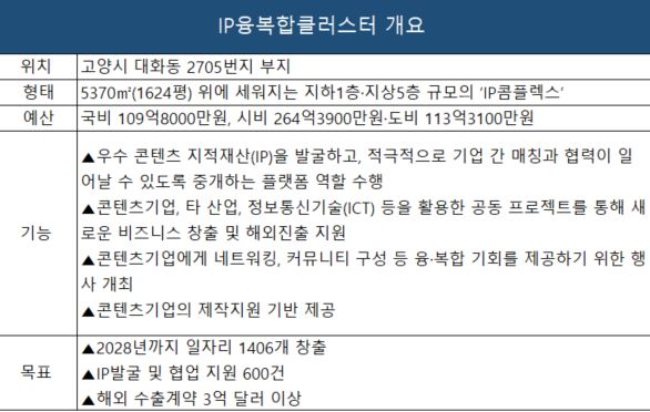 IP융복합클러스터는 방송·영상·웹툰·출판·K-팝과 관련된 우수 콘텐츠의 지적재산(IP)을 발굴할 뿐만 아니라 지적재산을 국내외에 확산시키는 플랫폼 역할을 하게 된다. 경기도 관계자는 “문체부가 방송영상밸리, 일산테크노밸리 등 주변 시설과 연계해 동반상승을 이룰 수 있다는 점을 높이 사서 전국 16개 광역시·도를 대상으로 실시한 공모에서 고양시가 최종 선정됐다”라면서 “IP융복합클러스터가 적극적으로 기업 간 매칭과 협력이 일어날 수 있도록 중개하는 역할을 수행하기 때문에 인근에 입주할 방송영상밸리, 일산테크노밸리 기업들은 IP융복합클러스터의 지원을 받는 기회가 좀 더 많을 것”이라고 설명했다.